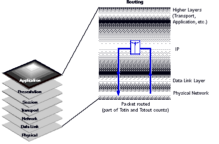 You can see that a single routed packet is counted in both Totin and Totout. When a server routes a packet, it receives the packet on one network interface, such as an Ethernet card, and sends the packet on another. The reception of the packet is counted as part of Totin. The sending of the packet is counted as part of Totout.