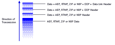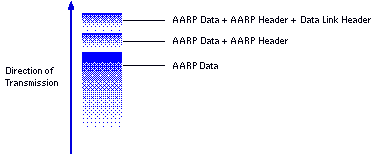 When application programs, such as the VINES AFP service, send data in a AppleTalk network, they deliver the data to the underlying layers. As the data moves downward through each layer, it is encapsulated in that layer's protocol headers for delivery to the appropriate destination. By the time the application data is transmitted on the LAN, it is encapsulated in several headers.