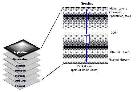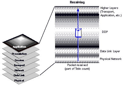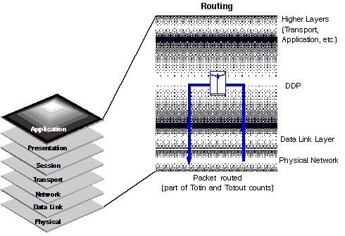 You can see that a single routed packet is counted in both Totin and Totout. When a server routes a DDP packet, it receives the packet on one network interface, such as an Ethernet card, and sends the packet on another. The reception of the packet is counted as part of Totin. The sending of the packet is counted as part of Totout.