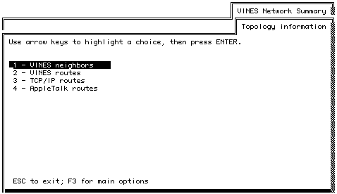 This menu allows you to access the available types of topology information on the server. The menu always displays VINES neighbors and VINES routes. The menu displays TCP/IP routes if the server is equipped with the TCP/IP Routing option or the TCP/IP Server-to-Server option. The menu displays AppleTalk routes if AppleTalk is configured on the server and the appropriate option is installed.