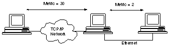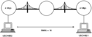 For example, the metric for the route between JPTOK001 (in Tokyo) and USCHI002 (in Chicago) in Figure 13-2 is 4. The routing software on JPTOK001 adds the metric for the Ethernet-to-T1 link (2) to the metric for the 16-Mbps Token-Ring link (2).