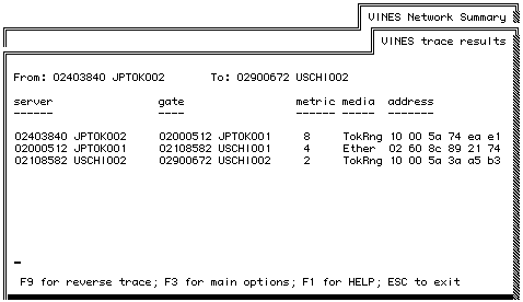 To trace a VINES route, choose TRACE a route from the VINES Network Summary menu.