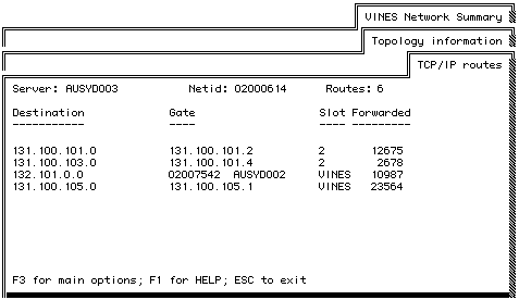 Two routes through VINES networks are shown below. These routes appear in the sample TCP/IP Routes screen.