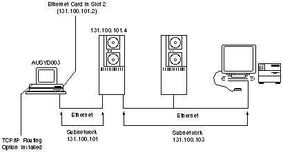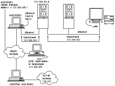 Note that a TCP/IP subnetwork with a subnetwork address of 131.100.105 consists of DOS workstations running the PC/TCP VINES Transport version and the server they use to route data to TCP/IP destinations.