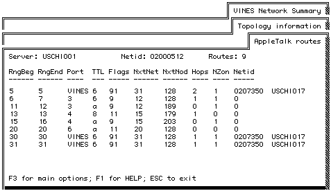 The top part of the screen displays the name of the server that you are currently monitoring, its network ID, and the number of routes in the routing table. For example, the sample AppleTalk Route Information screen tells you that USCHI001 is the server you are monitoring, the server's network ID is 02000512, and nine routes are in its routing table.
