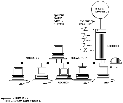 of 6 to 7 appears in USCHI001's AppleTalk routing table as follows:
