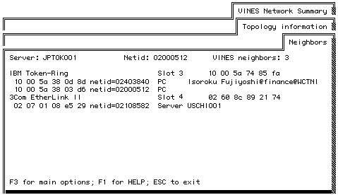 If you choose VINES neighbors from the topology information menu, the screen that appears displays the Table of Neighbors, which contains entries for each neighbor server and each neighbor DOS, Windows, or OS/2 workstation that runs VINES.