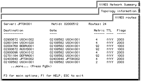 The top part of the screen displays the name of the server that you are currently monitoring, its network ID, and the number of routes in the routing table. For example, the sample VINES Routes screen tells you that JPTOK001 is the server you are monitoring, the server's network ID is 02000512, and 24 routes are in its routing table.