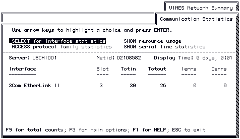 After you specify one or more server names, the VINES Network Summary menu appears, displaying the server you specified. See the section, "Displaying Configuration Information and Statistics" later on for more information on the VINES Network Summary menu.