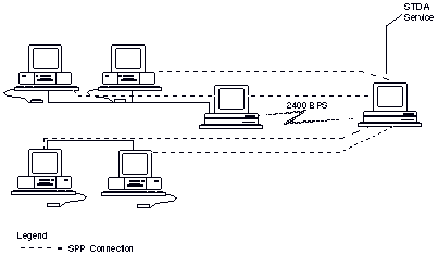 Figure 6-2 shows four SPP connections to an STDA service over a slow-speed serial line. This situation might create a bottleneck on both servers.