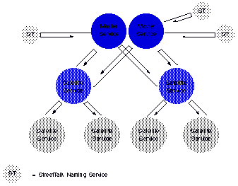 Figure 8-1 shows how master STDA services collect information from StreetTalk services and the order, from the top, in which master and satellites can download. Downloading is the process of a satellite retrieving data from a master or satellite service. A server from whose STDA database names are retrieved is called a download server.