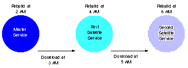 When you schedule rebuilds for master and the satellite services, schedule the master services to be the first service to rebuild, followed by the satellite services that are downloaded directly from the master services, followed by the satellites that these satellites are downloaded from directly, and so on. (This order is illustrated in Figure 8-1.) If you do not allow enough time for a service to complete its rebuild before the services that retrieve data from it begin to update their databases, the retrieving services may not receive all of the newest information.