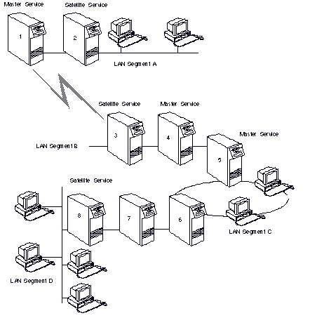 Server 8 has a satellite service. Otherwise, users on LAN Segment D would have to route through three servers (servers 6, 7, and 8) to reach the STDA master service on Server 5.