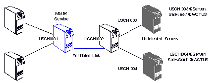 In Figure 8-5, Server USCHI001 can detect all the groups on Server USCHI002 across the restricted link. Server USCHI001 can detect only the groups USCHI003@Servers and USCHI004@Servers on Servers USCHI003 and USCHI004, respectively. It cannot collect the names in the SalesEast@WCTUS and SalesSouth@WCTUS groups.