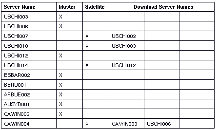Use the STDA Planning Worksheet, illustrated in Figure 8-6, to plan the location of STDA services on your network. Indicate the names of servers on which STDA services will be started and configured. Identify each of these as a satellite or master service. Each satellite must have at least one server from which it retrieves (downloads) its database. Note that in this worksheet example the WCT branch offices have their own master services. The satellite service on the Canadian server (CAWIN004) downloads from the Canadian master service on CAWIN003 and the American master service on server USCHI006.